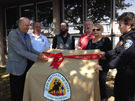 A group of people stand next to a sign covered in a brown cloth with the Anza Trail insignia on it while one person smiles and cuts a red ribbon tied around the cloth
