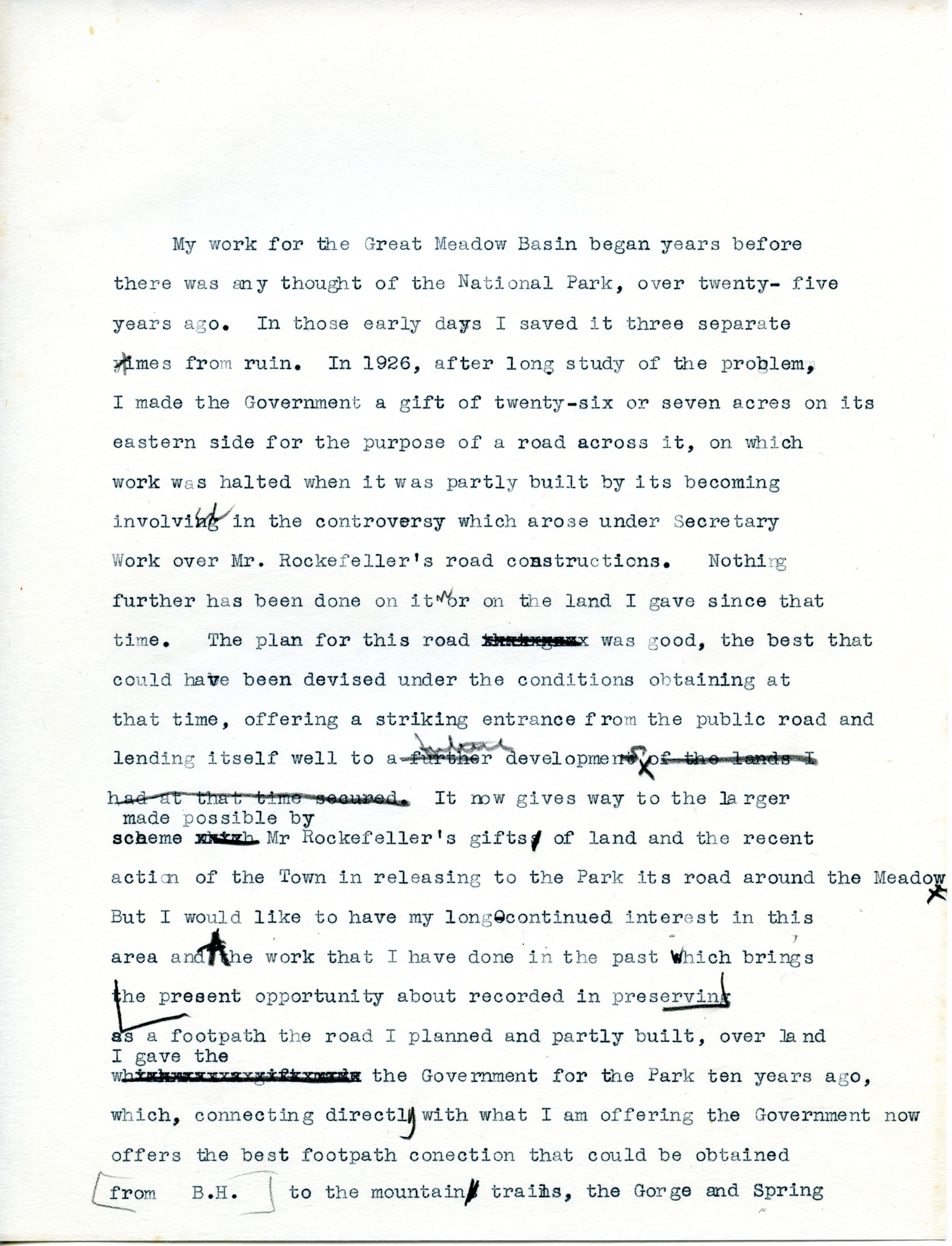Draft correspondence with handwritten edits documenting Dorr's involvement in the donation of the Great Meadow land, road, and footpath. Includes mention of the John D. Rockefeller's carriage roads.