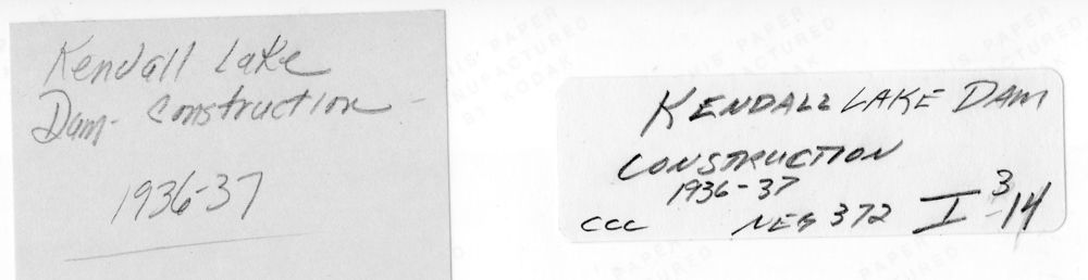 Construction of Kendall Lake & Dam, Civilian Conservation Corps ca. 1933. See scan of writing on the back of each image for additional details. || Many of the historic structures in the Virginia Kendall unit of Cuyahoga Valley National Park were built by Civilian Conservation Corps workers during the 1930s.