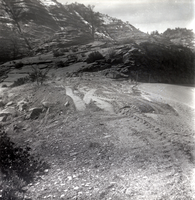 Wooden post in road crack during east side road repair and turn out construction. ; ZION Museum and Archives Image 002.13.01-51of53 ; ZION 15933