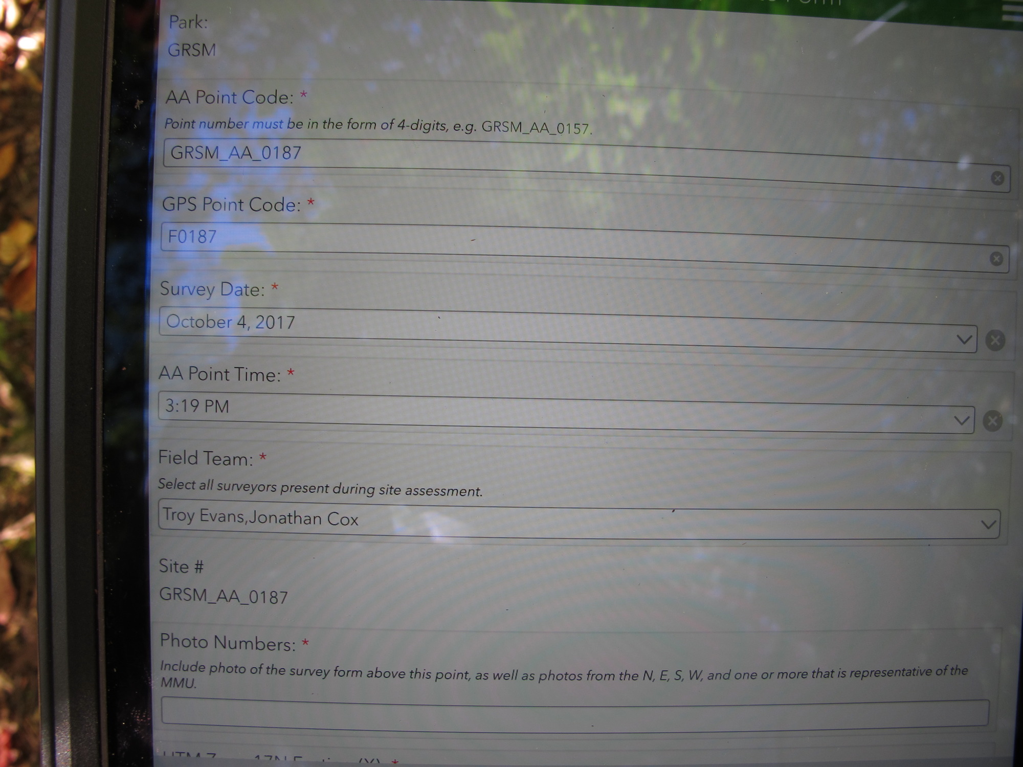 Plot Code: GRSM_AA_0187_1 from the Great Smoky Mountains National Park (GRSM) Accuracy Assessment.