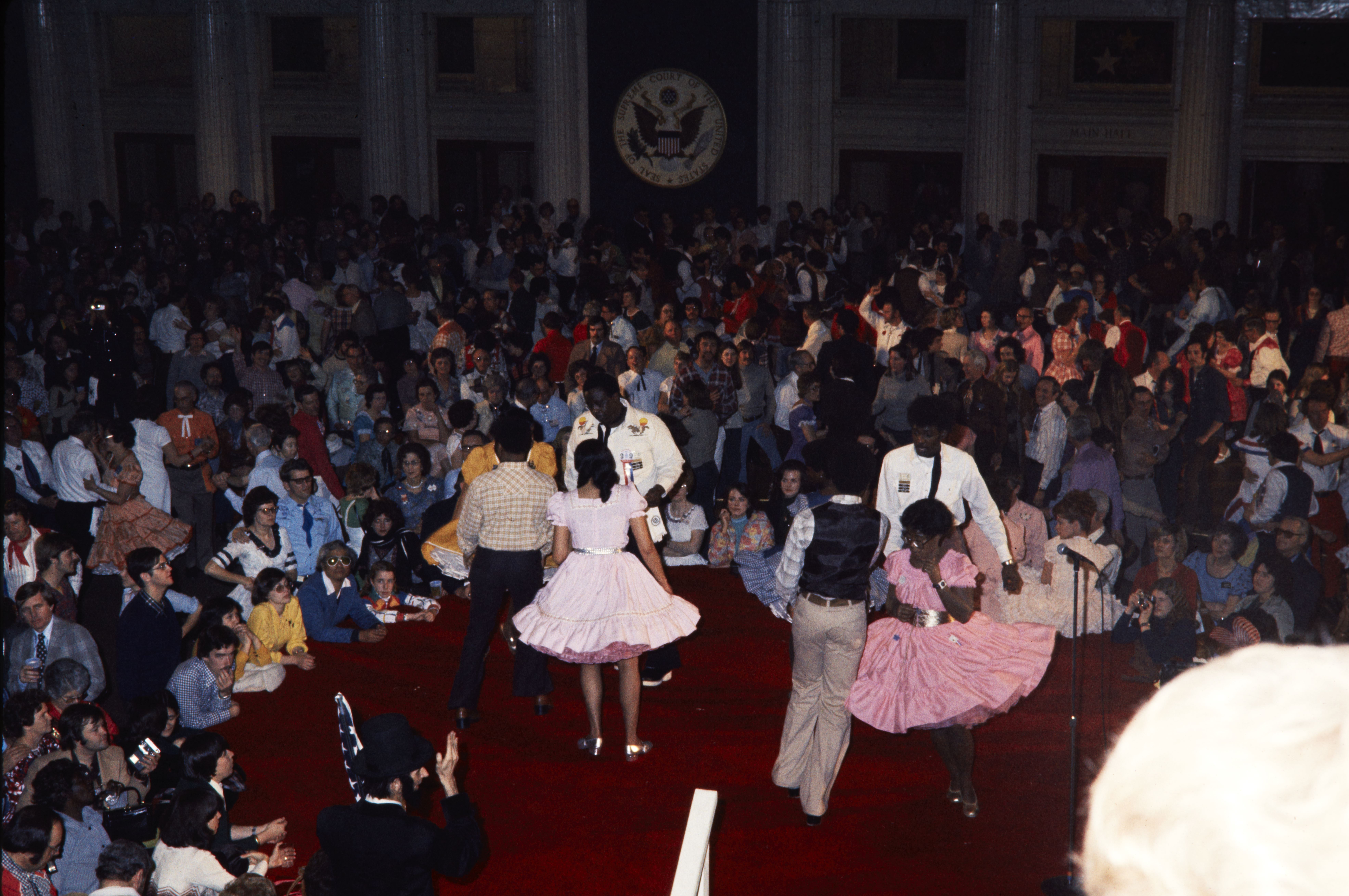 People in square dancing costumes dancing on a stage surrounded by people.