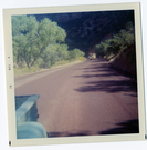 Two-way road divided by yellow dotted lines with Zion landscape in background. ; ZION Museum and Archives Image 002.12.02-24of31 ; ZION 15933