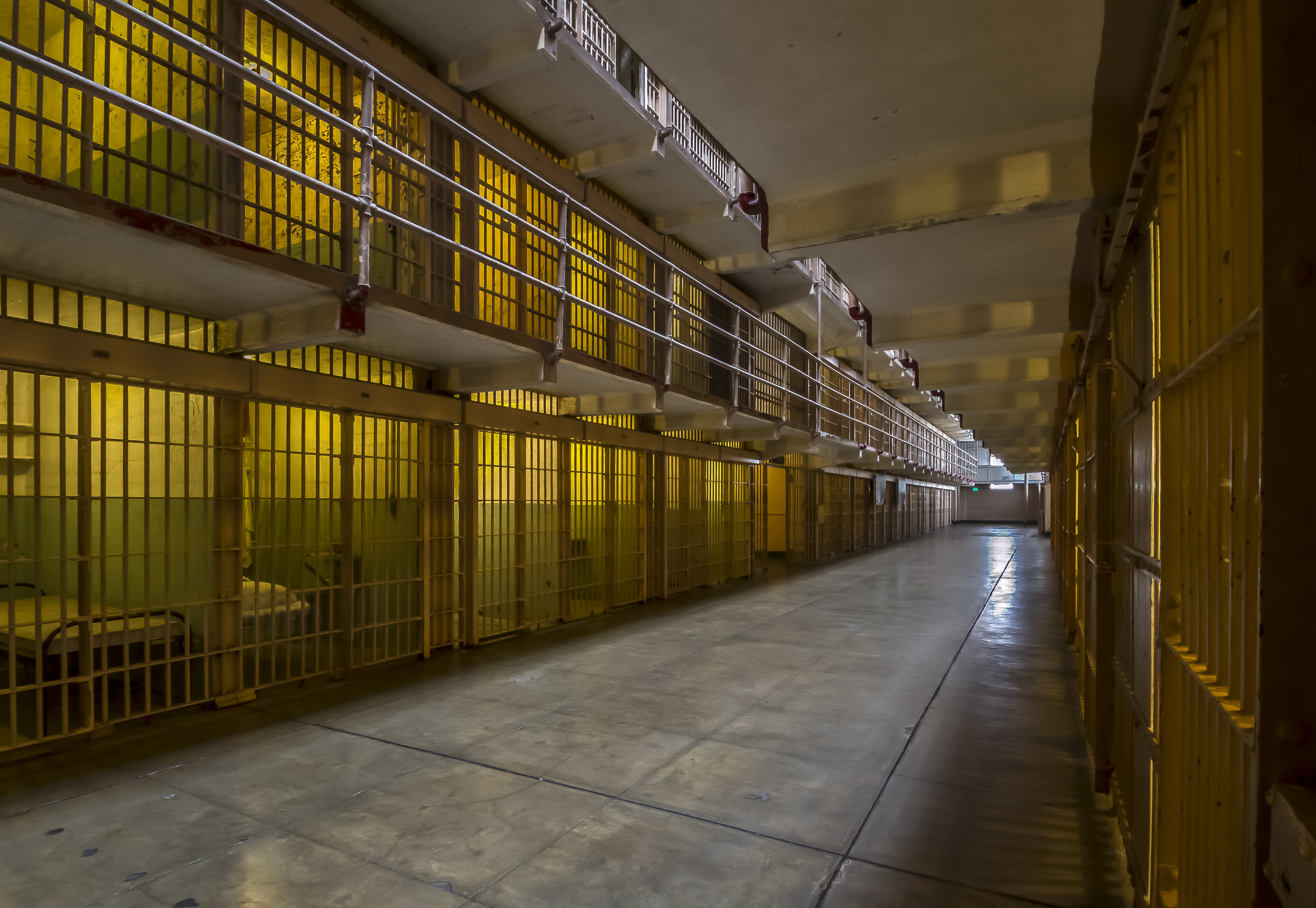 Evening light in the main cell block, shown from the doorway of a cell looking at the other wall of cells.