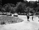 Visitor use, Zion Lodge - parked cars at cabin area of lodge, 7:30 a.m., September 3, 1961, Labor Day Weekend. ; ZION Museum and Archives Image ZION 9210 ; ZION 9210
