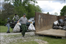RiverDay is an an annual day of service and celebration in the Cuyahoga Watershed. Activities are coordinated by Friends of the Crooked River. Cuyahoga Valley National Park is a partner. Our volunteers remove trash from dump sites in several locations and invasive plants from the area around Howe Meadow. || NPS staff and volunteers load garbage and bagged invasive plants into dumpster on RiverDay.