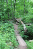 Small wooden bridge crossing a stream with a trail continuing behind it