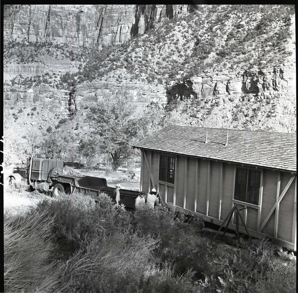 Zion Inn cabin being loaded on trailer by Kaibab-Paiute Tribe prior to removal. ; ZION Museum and Archives Image 004_10_017 ; ZION 15933