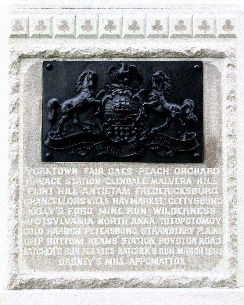 1 of 110 Monuments to Pennsylvania. Indicates advance position of 106th PA Infty Jul 3, 1863. LF&RF mark brigade line pos, 79'&72' from Mn, E side of Hancock. Mn, W side Hancock. Position Marker on E Cemetery Hill, shows held position July 2. || MN, LF&RF & Position Marker. MN: base 5'11"sq, 3 part shaft w/ bronze tablet & bas-relief, top of haversacks & drums (trefoil Corps symbol shape). All 12'4"H. Pos. Mkr 2'6"x1'x3'3"H, Inscrip faded, badly stained. LF&RF 10"sq x1'H.