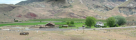 A panorama shows the expanse of property, including the ranch house and its surrounding trees, as well as a The ranch is a bright patch of green surrounded by rock formations.