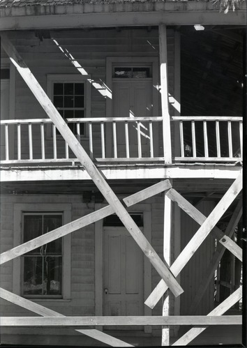 Detail of L. Smaus stereo (RL-16,522), captioned "The Upper House, Yosemite Valley, Mariposa County, Cal. 1088." Hutching's Hotel. copied by Michael Dixon, copied July 1985
