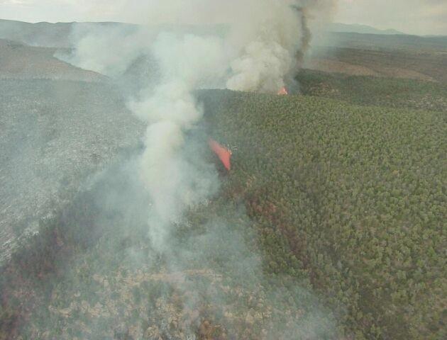 This series of photos shows the Long Mesa fire from the perspective of a helicopter, including smoke plumes, flames, and helicopters dropping flame retardant.