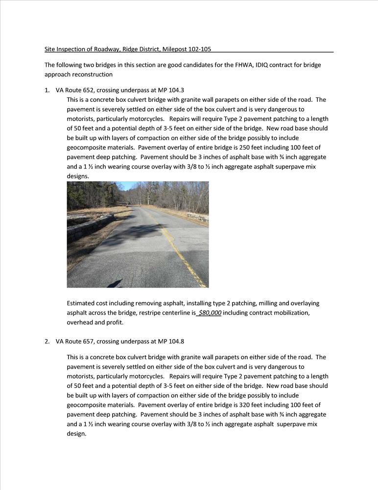 Inspection of two bridges, at MP 104.3 and 104.8, and mainline road between MP 102 and 105.