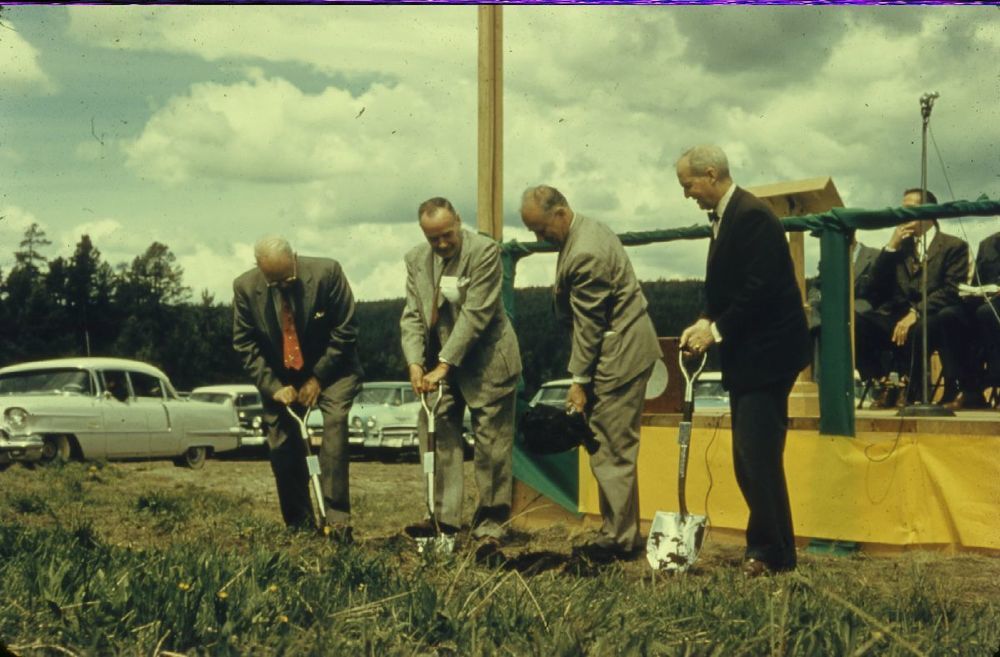 Group of four men breaking ground with shovels at some unidentified spot as part of the NPS Mission '66 program.