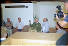 Color Photos of the opening celebration for the new visitor center - Same day as the official shuttle launch. Superintendent Donald A. Falvey speaking with visitor. ; ZION Museum and Archives Image 800_20_02035 ; ZION 15933