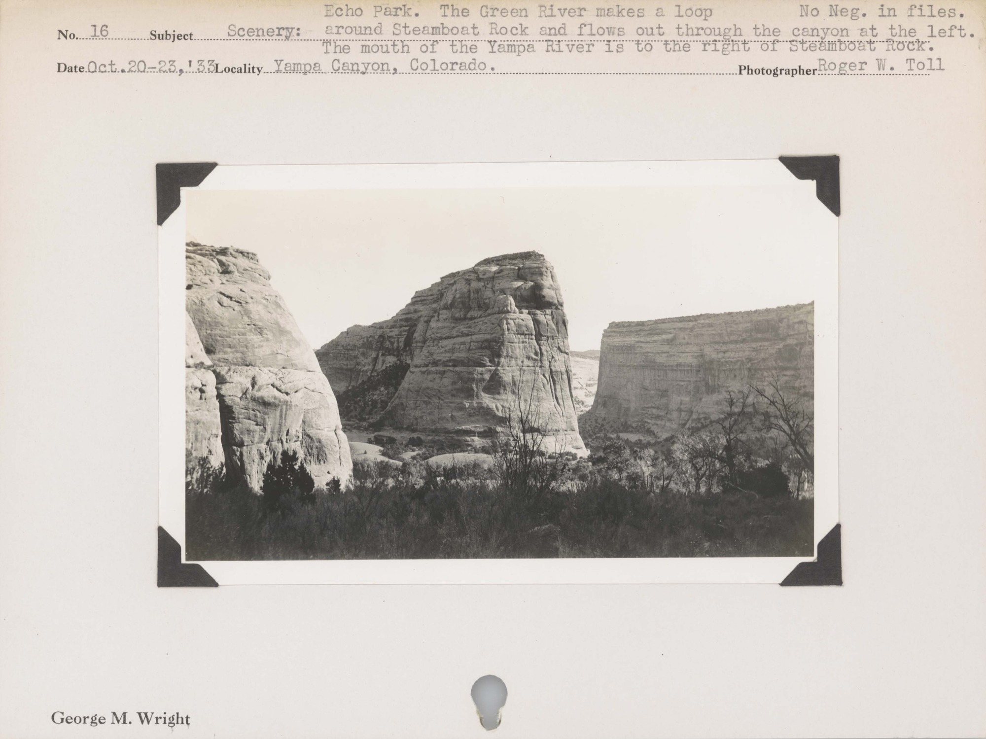Scenery: Echo Park. The Green River makes a loop around Steamboat Rock and flows out through the canyon at the left. The mouth of the Yampa River is to the right of Steamboat Rock. No negative on file. Locality: Yampa Canyon, Colorado. [Date actually reads Oct. 20-23, 1933 but only 1933-10-20 is used in metadata].
