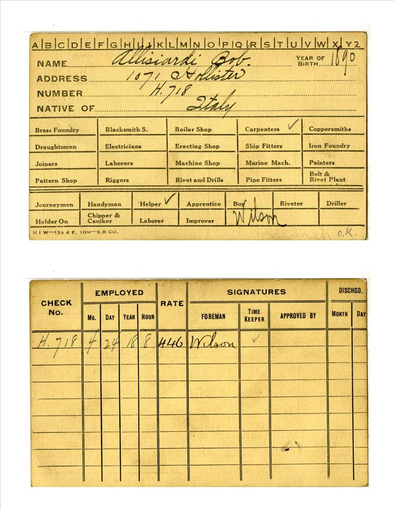 Union Iron Works Co. employee card for Robert Allisiardi