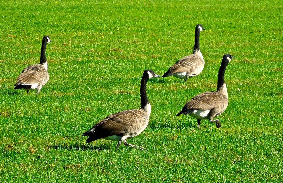 Four large geese walk across the grass in a flock.