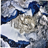 Color aerial photograph of glacier and snowfields on mountain peak.