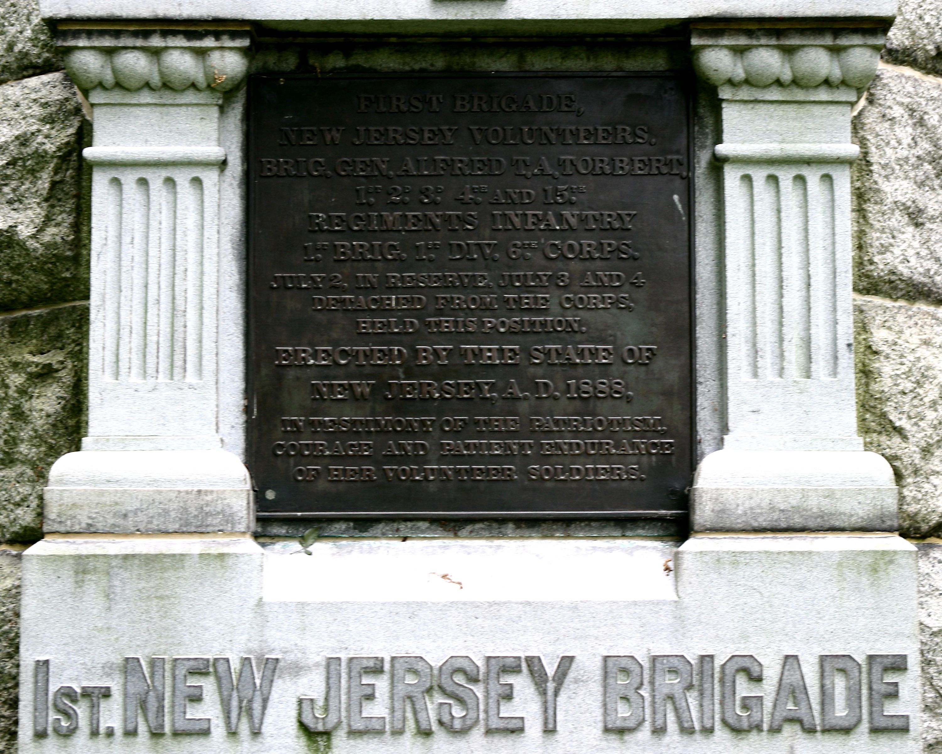 1 of 12 Mn to NJ. Only Mn to honor 1st, 2nd, 3rd, 4th, & 15th NJ regiments. Indicates general position held by Brigade Jul 2-3, 1863. Flank Markers denote specific line positions. Vista opened to Mn 1902. Located E side of N Sedgwick Av. || Mn w/ 4 flank markers. Base 7'dia. Coursed, rough-cut shaft w/ decorative banding on turret design. Excised lettering base, minature temple surrounds front bronze tablet. Bronze tablet, back, bas-reliefs sides. All 12'H. Mkrs eroded, 1'sq x 1'5".