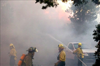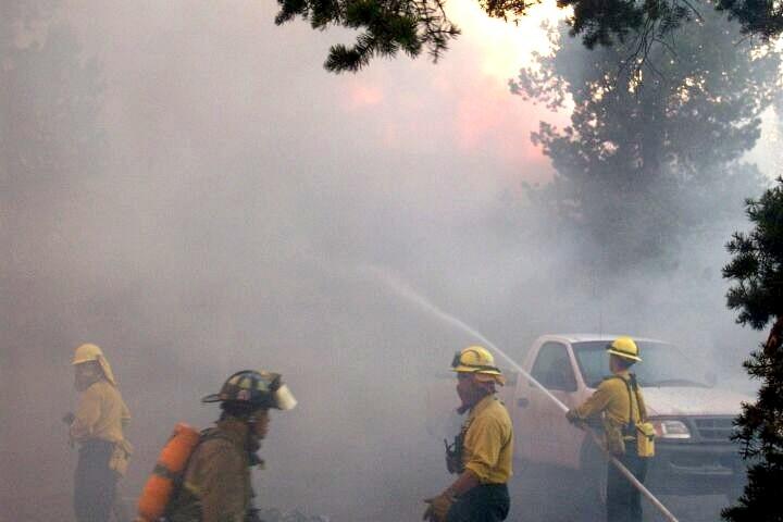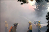 Fire fighters use hoses to battle structural fires during the Long Mesa fire at Mesa Verde National Park, summer 2002.