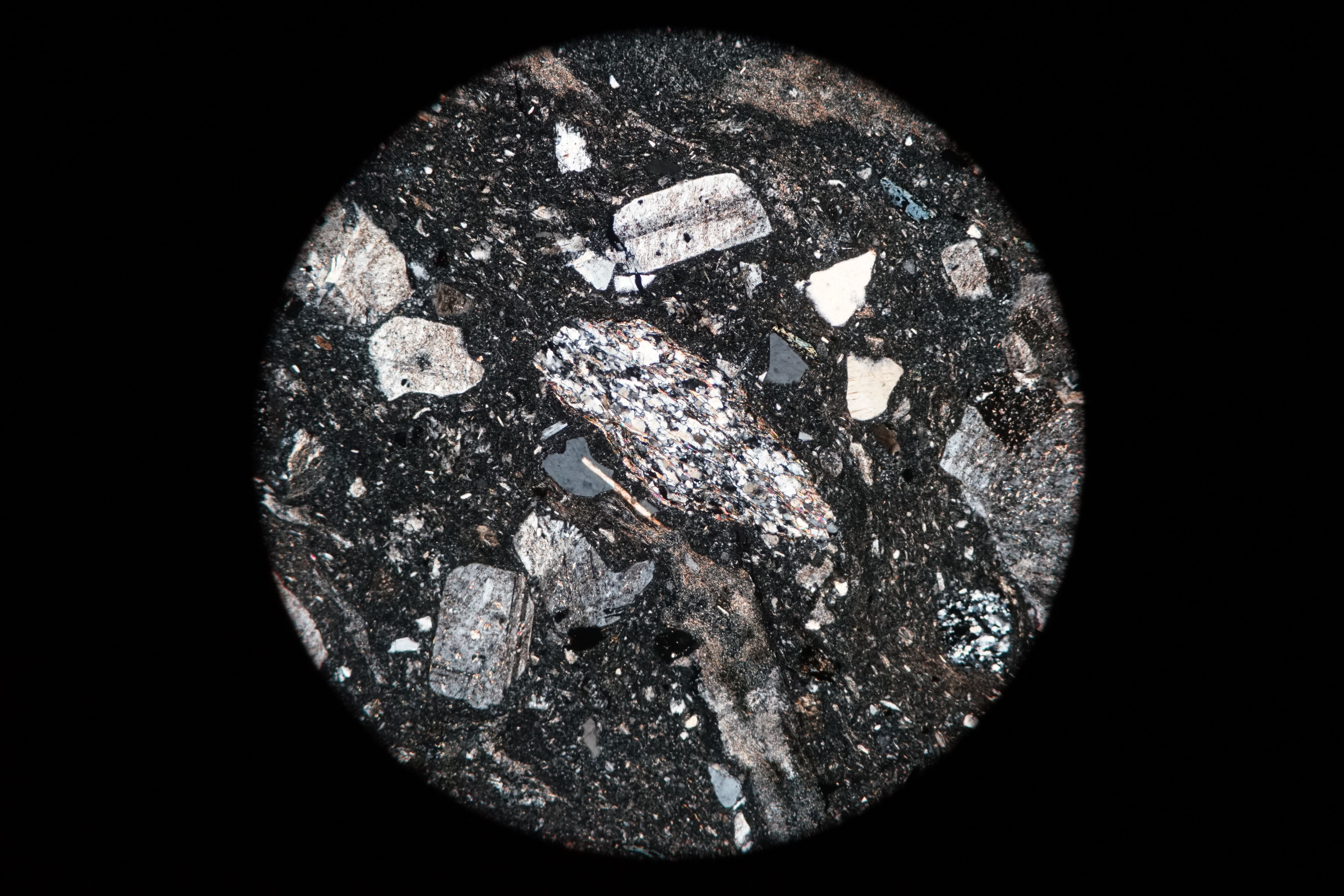 Microscopic image of a thin section of volcanic brecia collected by Peter Misch near Silesia Creek in 1960. One of six images. (Peter Misch Geology Collection, North Cascades NPS Complex Museum Collection.)