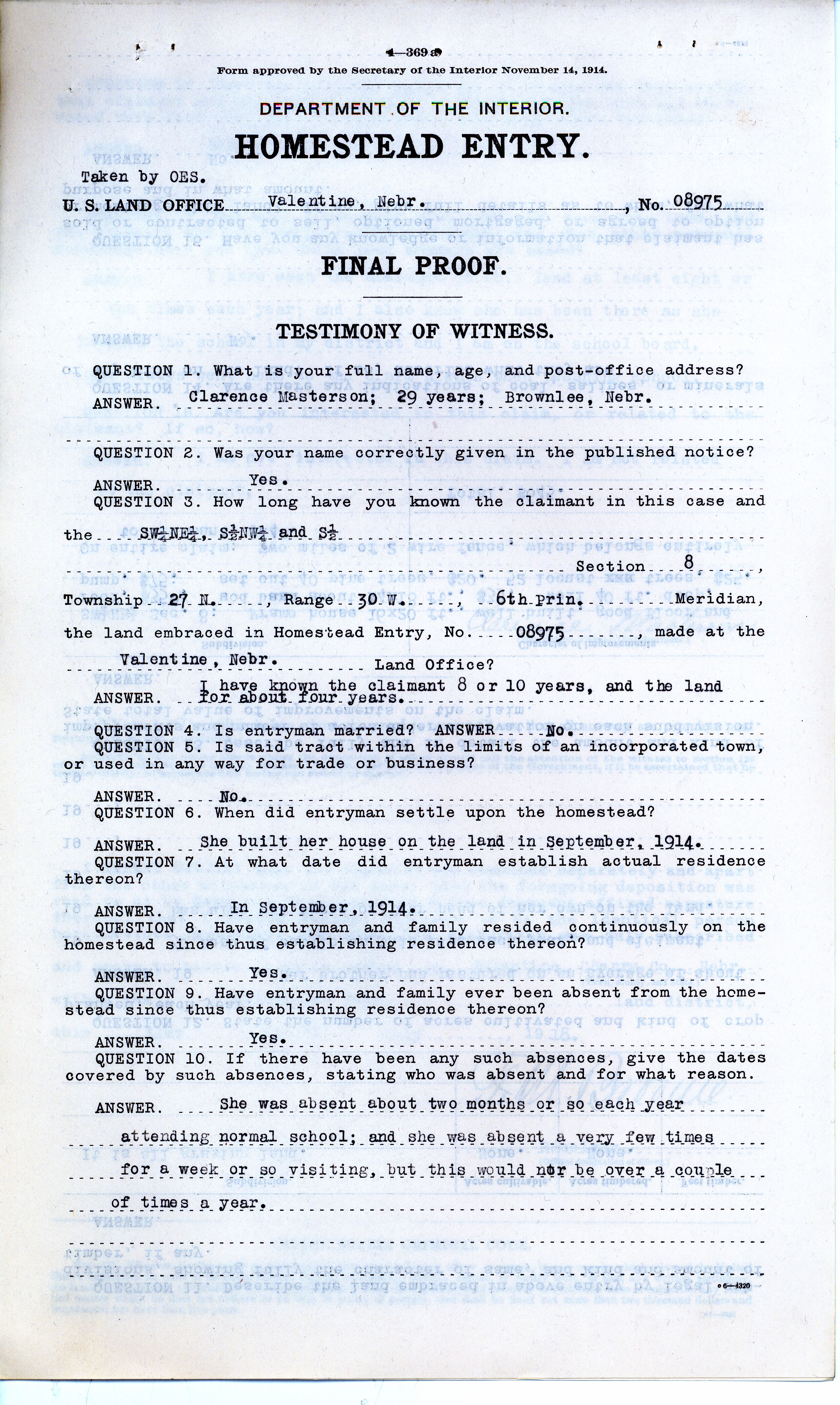 ANSWER. She built her house on the land in September, 1914.
