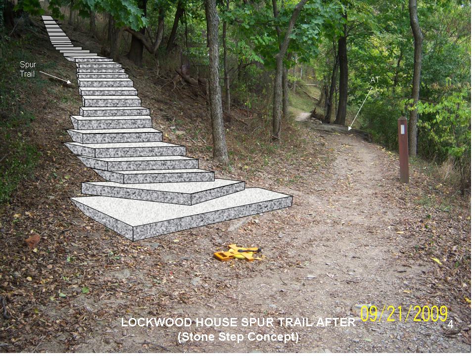 The Lockwood House spur trail is unsafe due to natural erosion factors. The Park has received a grant through CTTP (Connect Trails To Parks). Work will begin in June 2010 to lay stone steps on the eroding trail. This work will be done by volunteers the Potomac Appachian Trail Club sponsored by the Appalachian National Scenic Trail. Photo Taken 09/21/09.