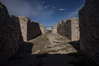 Inside the ruins at Gran Quivira. The mission walls form both sides of the picture. The old mission doors, which are no longer existing, is in the center of the picture. A blue sky is over head.