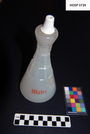 Long neck pressed white glass bottle, white porcelain stopper. Lettered in red on front "WATER"