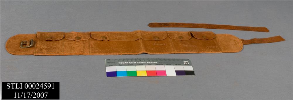 A)LONG, BROWN LEATHER STRIP WITH ROUNDED ENDS. THE ENDS HAVE MACHINE SEWN EDGES WITH A TORN STRIP OF LEATHER SEWN ON ONE END, AND A SILVER-COLORED METAL BUCKLE ATTACHED TO THE OTHER END. THERE ARE FIVE POCKETS WITH BROWN COLORED METAL SNAPS CLOSING THE ROUNDED TOP FLAPS. ONE POCKET HAS 2 SNAPS. NAMES OF DIFFERENT COUNTRIES ARE SCRATCHED ON THE FLAPS AND POCKETS, INCLUDING AFRICA, FRANCE, BELGIUM AND AUSTRIA. THE OTHER SIDE IS SMOOTH. B)BROWN STRIP OF LEATHER WITH 7 HOLES FOR A BUCKLE. THE END IS TORN.