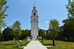 A paved path in grassy grounds leads to a tall granite monument with spire