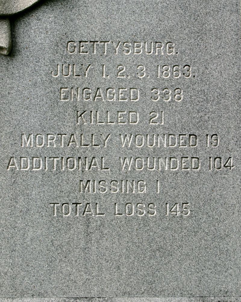 1 of 20 Mns in Park to Ohio commands in Gettyburg Campaign. Marks position held by infantry during July 1 - 3, 1863. Mn moved approx 90' w/in bounds of National Cemetery Annex, near center line held by regiment. || Mn & 2 flank markers. Mn base 6' sq rough cut. 2 part shaft, 1st part w/excised polished letters. 2nd w/excised polished letters front, sides polished w/incised inscriptions. Pryamid top w/sculptured draped flag. All 10'6"H. LF&RF: 1'sq x 2'H.