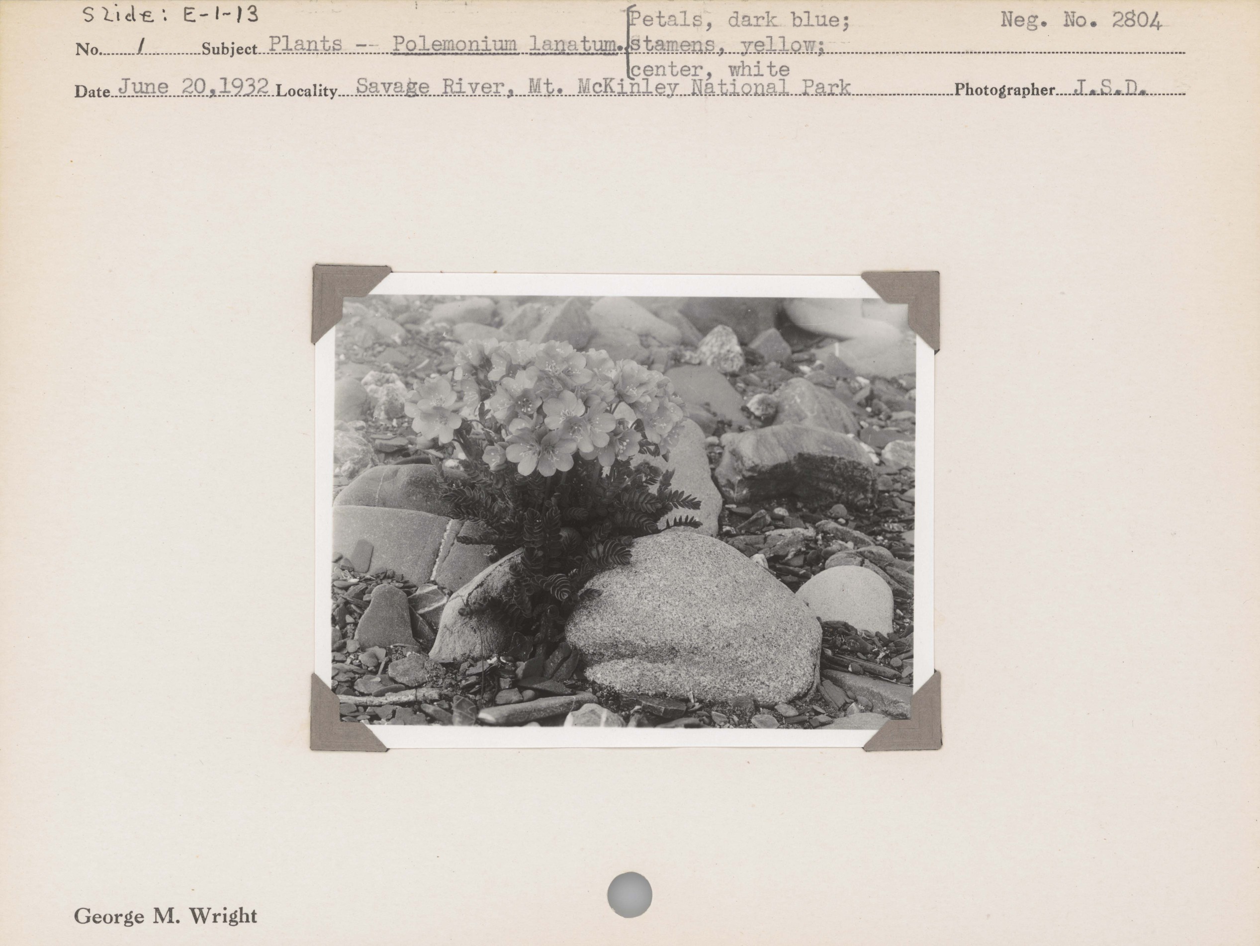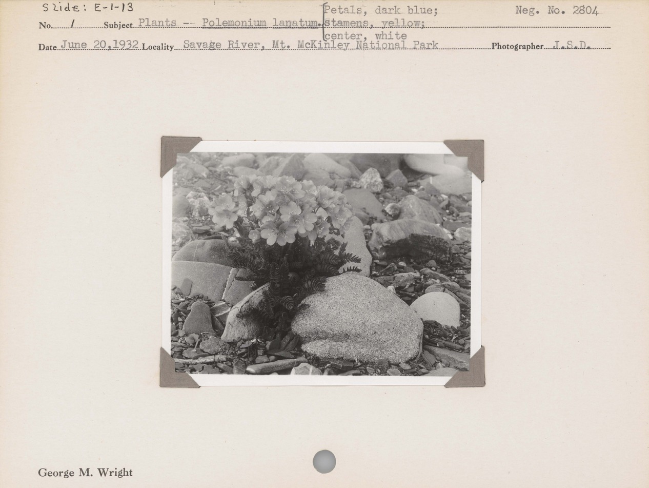 Plants--Polemonium lanatum. Petals, dark blue; stamens, yellow; center, white. Locality: Savage River, Mount McKinley National Park [Denali National Park & Preserve]. Negative #: 2804