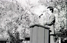 BW Photos of the Zion Lodge Rededication Ceremony. Superintendent Harold (Harry) Grafe speaking with man and woman.