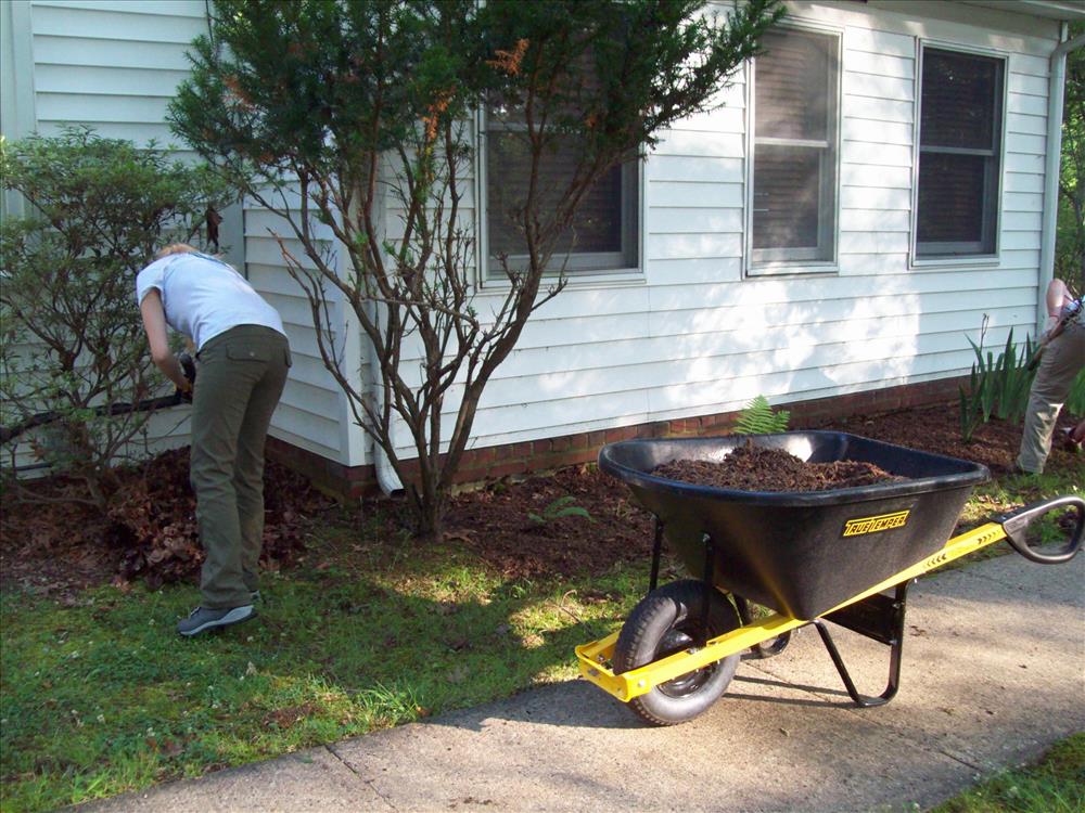 YCC cleanup and mulch flower beds at Headquarters Bldg