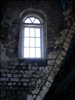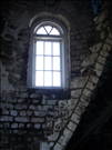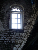 interior of bottom level facing north, showing window and steep brick spiral stair.