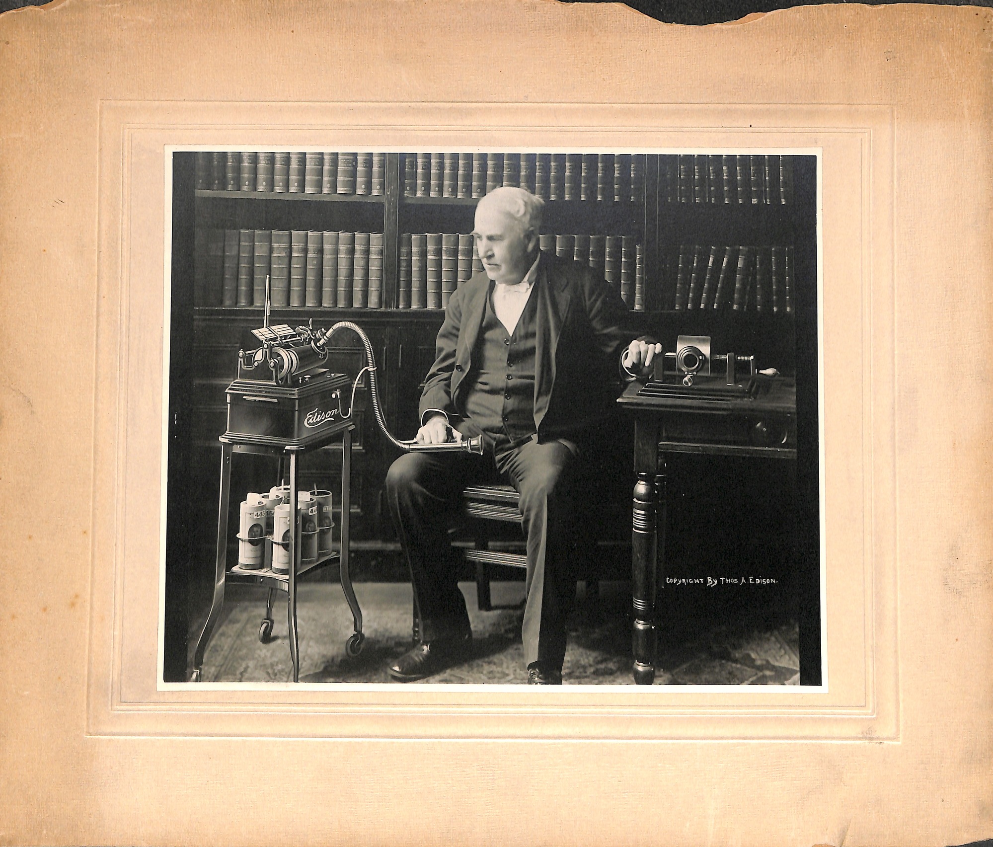 Thomas Edison with dictating machine and phonograph.