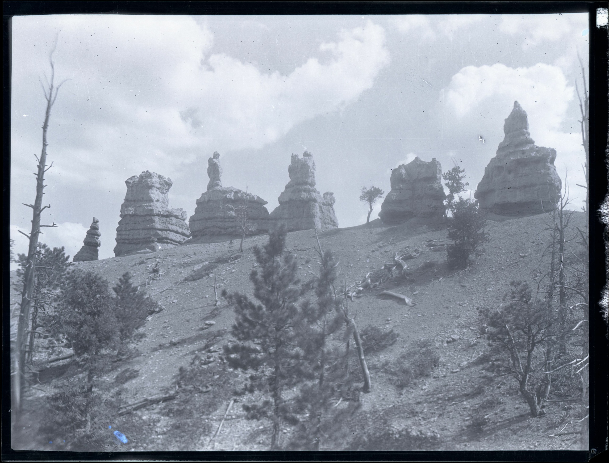 Nitrate negative of hoodoos along ridge from below the rim in BRCA. Trees and vegetation in foreground. ; BRCA Museum and Archives Image BRCA8875_001_462 ; BRCA 8875