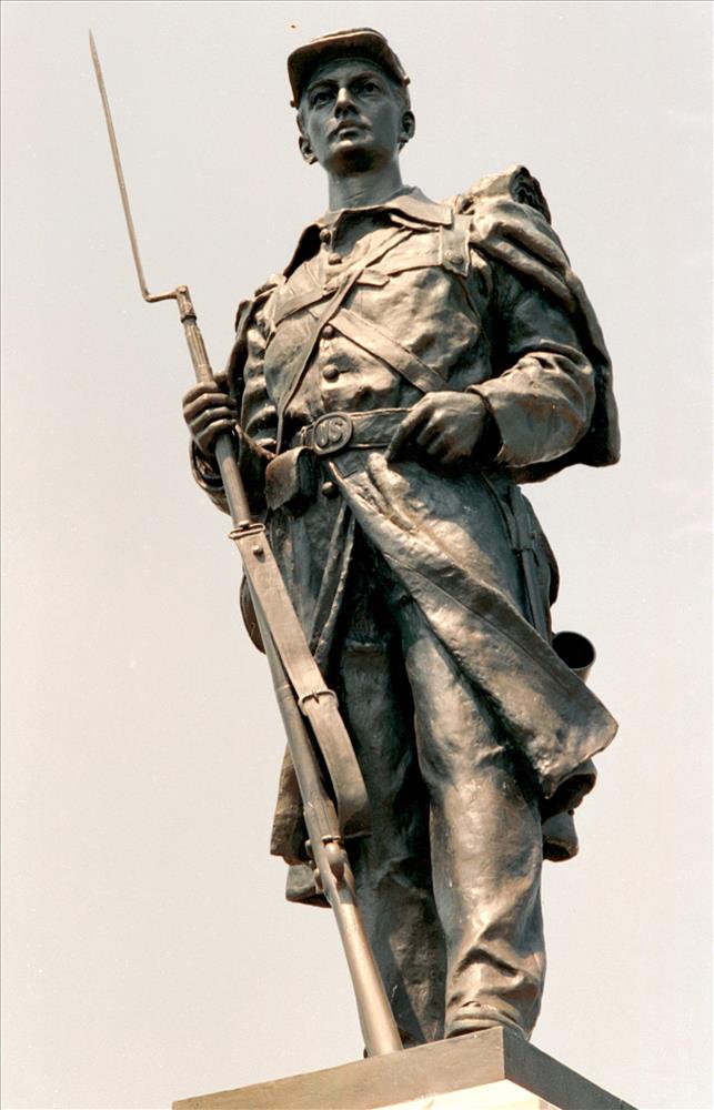 Structure Number: 99 || 8'h bronze statue of a vol infantryman atop 11.5'h granite pedestal. Statue holds rifle in proper R hand. On pedestal cap is 5 pt star. Rough-dressed 3 tier base w/PA coat of arms on 3rd step. Located at Starke Ave/Old Hagerstown Pike. || Built in 1904 by the State of Pennsylvania and the Survivor's Association; sculpted by Pierre Fietu