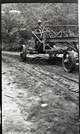 Worker driving a road grader following another worker on a caterpillar tractor on the floor of the valley road spreading paving materials. Labeled 'experimental road paving.'