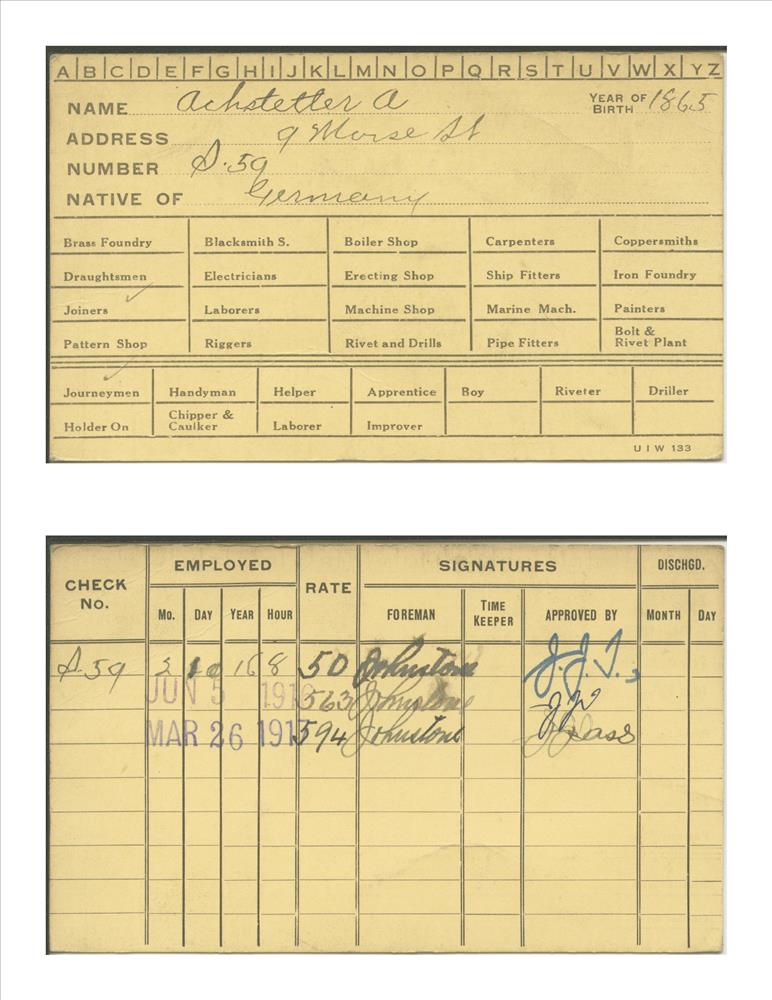 Union Iron Works Co. employee card for A. Achstetter