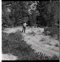Chief Park Ranger Nick Nicholson and Park Superintendent Robert C. Heyder surveying the illegally constructed dirt road from Potato Hollow to Kolob Creek showing the bulldozer graded road section on park land. ; ZION Museum and Archives Image 101_02_006 ;