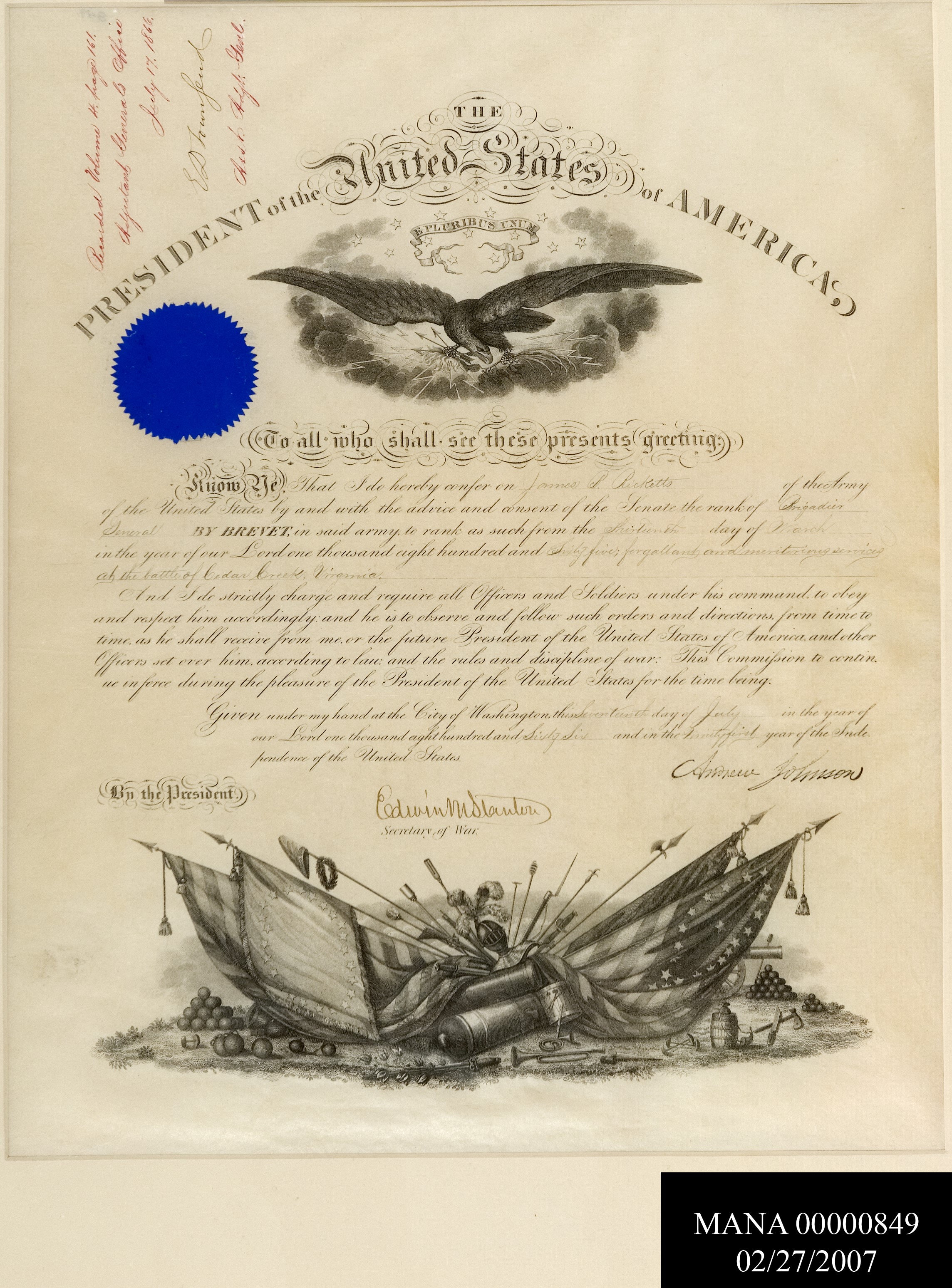 COMMISSION OF JAMES B. RICKETTS TO RANK OF BREVET BRIGADIER GENERAL, EFFECTIVE: 13 MARCH 1865. DATED & RECORDED: 17 JULY 1866; SIGNED: EDWIN M. STANTON, SECRETARY OF WAR, ANDREW JOHNSON (BOTTOM), & E.D. TOWNSEND, ASST. ADJT. GENL (TOP). WAR OFFICE BLUE SEAL AFFIXED. MATTED.