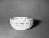 Marie Rozier Collection, Catalog No. 127. Object: Northwest Coast basket. Dimensions: 8 x 8 1/2". Materials: Red cedar root, beargrass. Technology: Plain twined, up to right slant of turns. Collection History: Purchased in Yellowstone in 1928 by Mary Long.