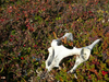 A sun bleached pelvis from a caribou is not an uncommon site on the tundra thick with blueberries and cranberries in the fall. Accessibility statement: White bones lie on a thick mat of plants that include blue and red berries.