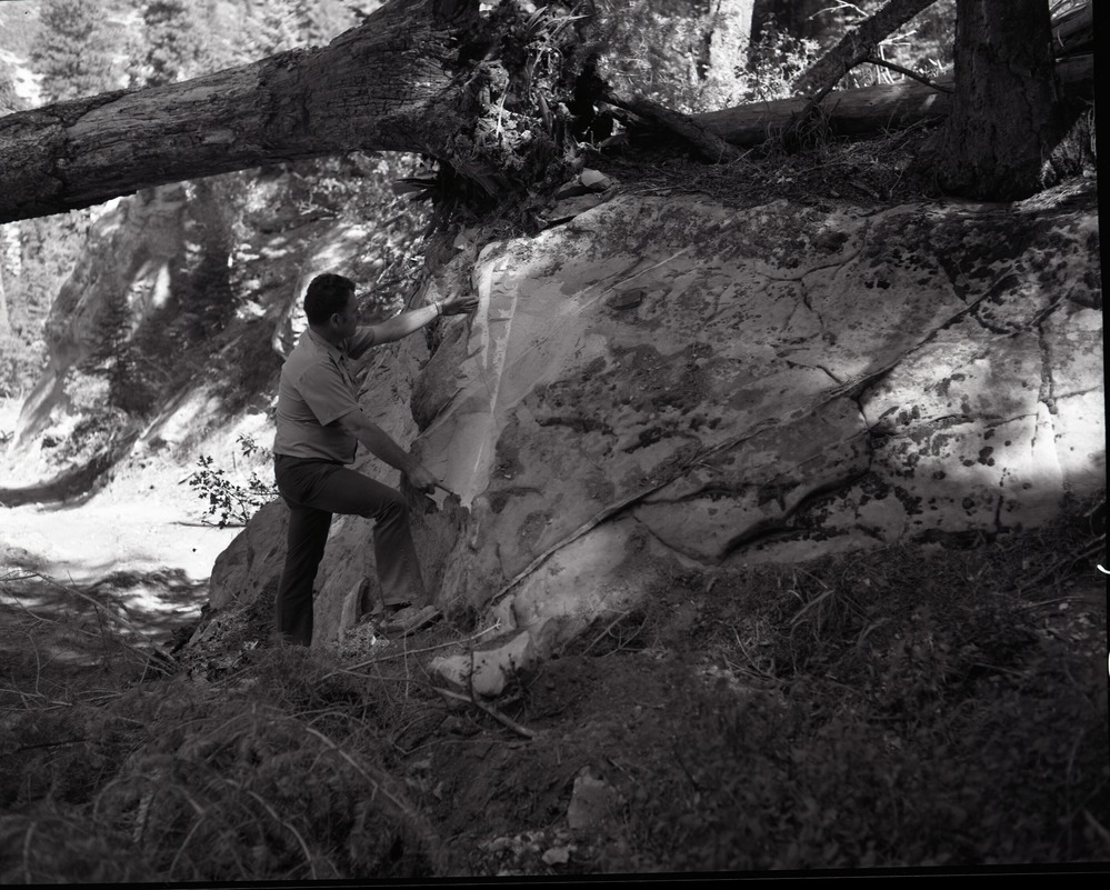 Chief Park Ranger Nick Nicholson and Park Superintendent Robert C. Heyder surveying the illegally constructed dirt road from Potato Hollow to Kolob Creek showing the bulldozer graded road section on park land. ; ZION Museum and Archives Image 101_02_006 ;