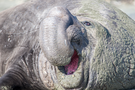 Male northern elephant seal with a large proboscis with its mouth wide open, vocalizing.