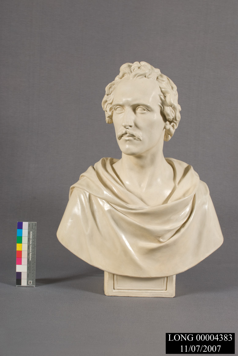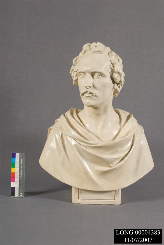 PLASTER PAINTED WHITE. BUST-LENGTH PORTRAIT, WITH SHOULDERS AND DRAPERY, FACING PROPER RIGHT. EAR-LENGTH HAIR, BLANK EYEBALLS, MOUSTACHE, AND CLOSED LIPS. BUST ROUNDED AT BOTTOM WITH A RECTANGULAR BASE.