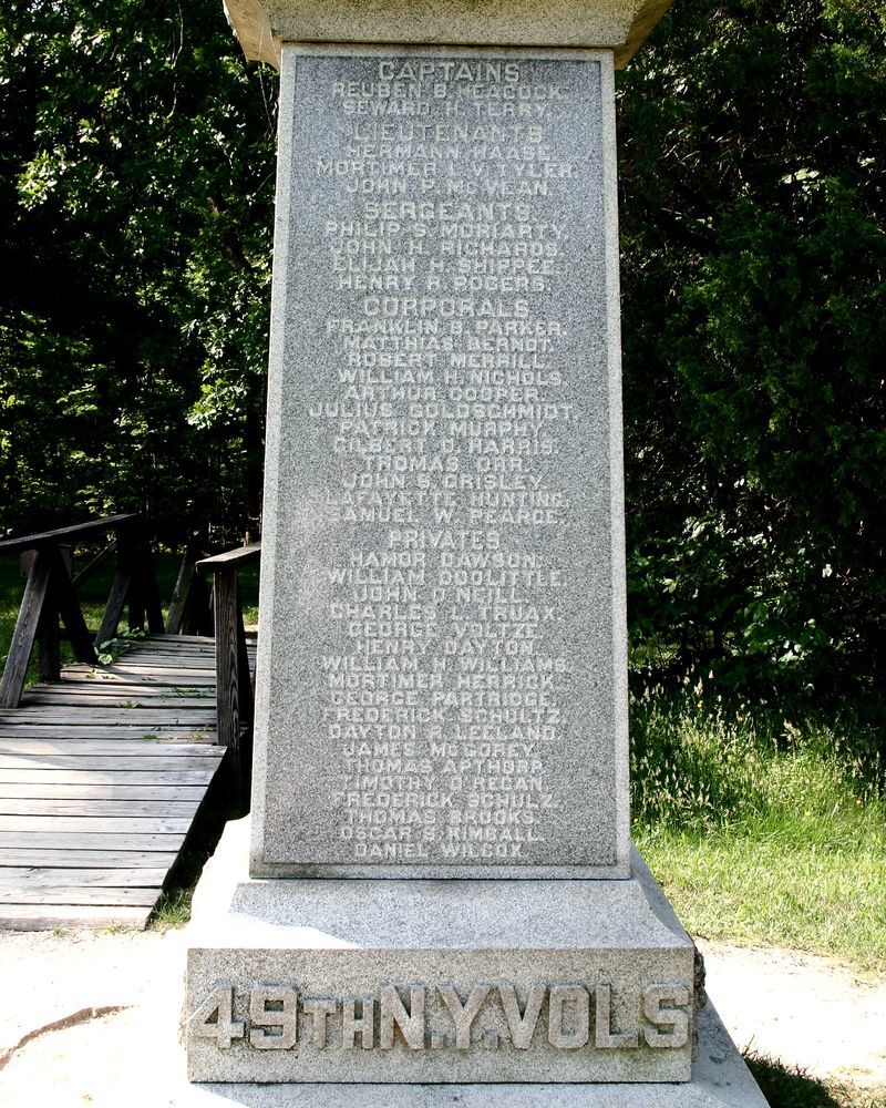 Monument commemorating the holding of this position by 49th New York Regiment at the Battle of the Bloody Angle, May 12, 1864 during the Battle of Spotsylvania. Erected by survivors in 1902. || Rough-hewn, tooled edge, stepped base 2'Hx 3'4"Wx 3'4"D supports square shaft 6'H w/ 4 polished faces bearing incised inscription. Rough-hewn, rounded capital is inscribed on 4 sides w/ Corps insignia & topped by stacked cannon balls.